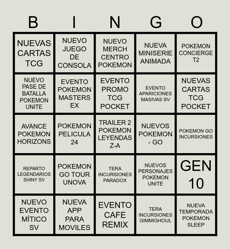 This bingo card has a free space and 24 words: POKEMON GO TOUR UNOVA, NUEVA APP PARA MOVILES, EVENTO PROMO TCG POCKET, NUEVO EVENTO MÍTICO SV, POKEMON CONCIERGE T2, NUEVAS CARTAS TCG, NUEVO PASE DE BATALLA POKEMON UNITE, NUEVO JUEGO DE CONSOLA, NUEVOS POKEMON - GO, TERA INCURSIONES PARADOX, EVENTO APARICIONES MASIVAS SV, AVANCE POKEMON HORIZONS, NUEVOS PERSONAJES POKEMON UNITE, GEN 10, EVENTO POKEMON MASTERS EX, TERA INCURSIONES GIMMIGHOUL, POKEMON GO INCURSIONES, NUEVO MERCH CENTRO POKEMON, NUEVAS CARTAS TCG POCKET, POKEMON PELICULA 24, NUEVA TEMPORADA POKEMON SLEEP, REPARTO LEGENDARIOS SHINY SV, NUEVA MINISERIE ANIMADA and EVENTO CAFE REMIX.