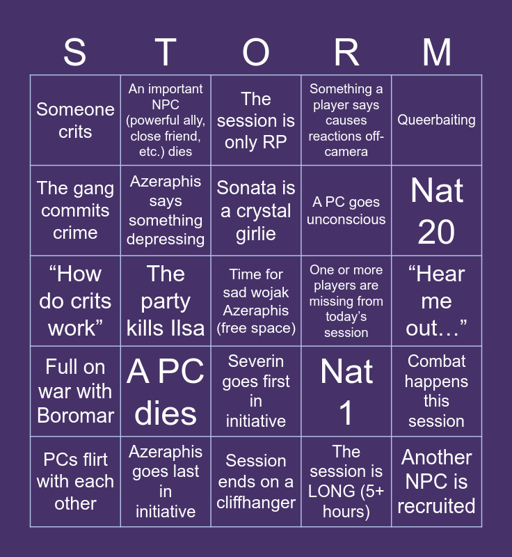 This bingo card has a free space and 40 words: “Naughty/slutty/Asmongold 20”, “How do crits work”, We learn more about Sytra, Azeraphis says something depressing, Azeraphis goes last in initiative, Severin goes first in initiative, Sonata is a crystal girlie, “Kohl” is in trouble, Queerbaiting, Full on war with Boromar, The party kills Ilsa, Something a player says causes reactions off-camera, Another NPC is recruited, “Hear me out…”, One or more players are missing from today’s session, A PC dies, BG3 reference, Someone crits, Stick sells drugs, The session is only RP, Combat happens this session, The session is LONG (5+ hours), A PC goes unconscious, The gang commits crime, More BlinkysTM, Someone gets in trouble with the law, LotR references, Queen Emma is here to save the stream, The Patreon names break Jacob, 8EER-8OT survives the session, ~technical difficulties~, PCs flirt with each other, PCs flirt with NPCs, Nat 1, Nat 20, Session ends on a cliffhanger, More Sev x Azeraphis action, Someone cracks Jack with the initiative card memes, An important NPC (powerful ally, close friend, etc.) dies and The party hunts down Sytra.