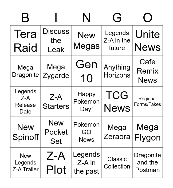 This bingo card has a free space and 24 words: New Legends Z-A Trailer, New Pocket Set, Gen 10, Classic Collection, Unite News, Tera Raid, Discuss the Leak, New Megas, TCG News, Regional Forms/Fakes, Legends Z-A Release Date, Mega Zygarde, Mega Zeraora, Mega Flygon, Mega Dragonite, Z-A Plot, Legends Z-A in the past, Legends Z-A in the future, Cafe Remix News, New Spinoff, Z-A Starters, Pokemon GO News, Anything Horizons and Dragonite and the Postman.