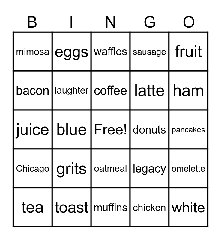 This bingo card has a free space and 24 words: grits, toast, coffee, tea, fruit, mimosa, bacon, eggs, donuts, oatmeal, latte, juice, legacy, omelette, laughter, chicken, pancakes, waffles, ham, blue, white, Chicago, sausage and muffins.
