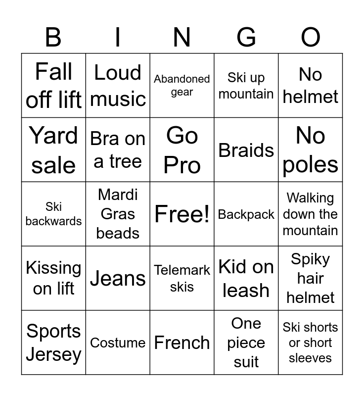 This bingo card has a free space and 24 words: Jeans, Costume, Go Pro, Sports Jersey, No helmet, Fall off lift, Yard sale, Loud music, Backpack, Telemark skis, Braids, Ski backwards, Kid on leash, Spiky hair helmet, Bra on a tree, One piece suit, Walking down the mountain, Abandoned gear, No poles, Mardi Gras beads, Ski shorts or short sleeves, Kissing on lift, Ski up mountain and French.