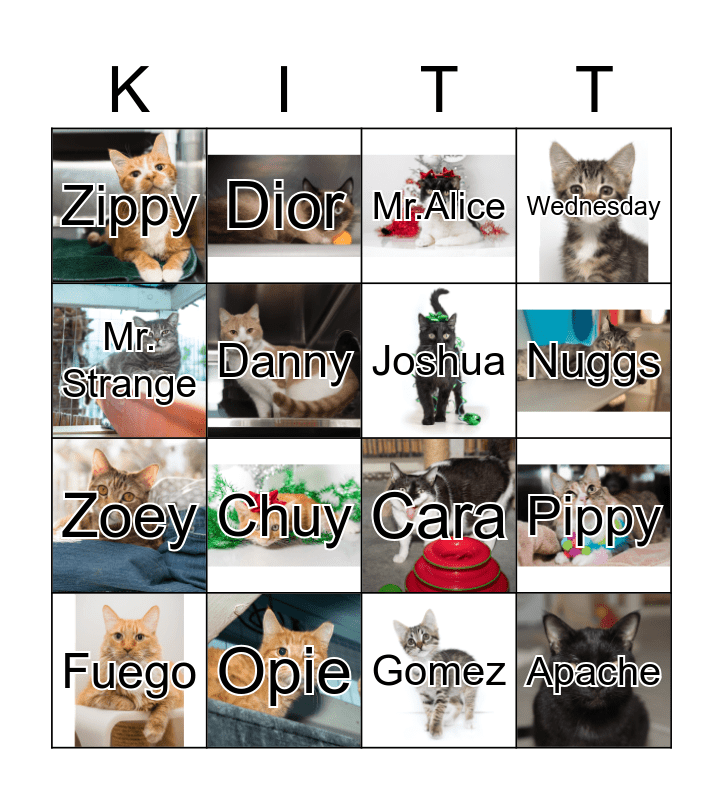This bingo card has 29 images and 29 words: Rachel, Triplets, Pippy, Sheba, Zippy, Mr.Alice, Joshua, Maggie Mae, Opie, Hypnos, Gomez, Fuego, Demi, Danquo, Chuy, Chat, Alaska, Apache, Mr. Strange, Cara, Little Grey, Ronnie, Zoey, Danny, Wednesday, Dior, Greg, Nuggs and Babu.
