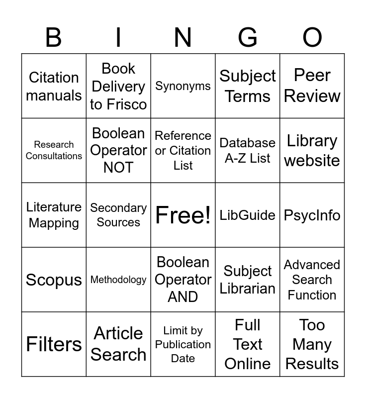 This bingo card has a free space and 34 words: Quotation Marks, Full Text Online, Literature Review, Interlibrary Loan, Scopus, Boolean Operator NOT, Peer Review, Filters, Book Delivery to Frisco, Frisco Landing Library, Reference or Citation List, Synonyms, Truncation (wildcard), Ask Us Service, LibGuide, Library website, Article Search, Literature Mapping, Methodology, Subject Librarian, Boolean Operator AND, Keyword searching, Citation manuals, PsycInfo, Limit by Publication Date, Too Many Results, Subject Terms, Boolean Operator OR, Database A-Z List, Research Consultations, Empirical (Primary) Sources, Secondary Sources, Advanced Search Function and Abstract.