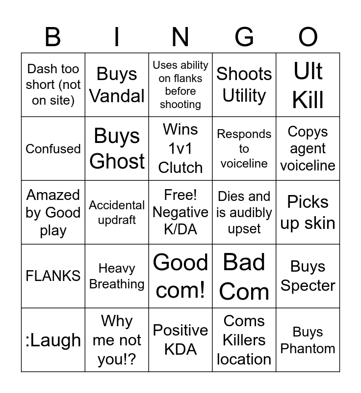 This bingo card has a free space and 24 words: Heavy Breathing, Why me not you!?, Wins 1v1 Clutch, :Laugh, Ult Kill, Dash too short (not on site), Confused, Buys Vandal, Dies and is audibly upset, Good com!, Responds to voiceline, Amazed by Good play, Bad Com, Buys Specter, Buys Ghost, Coms Killers location, Picks up skin, Uses ability on flanks before shooting, Copys agent voiceline, Accidental updraft, Buys Phantom, FLANKS, Shoots Utility and Positive KDA.