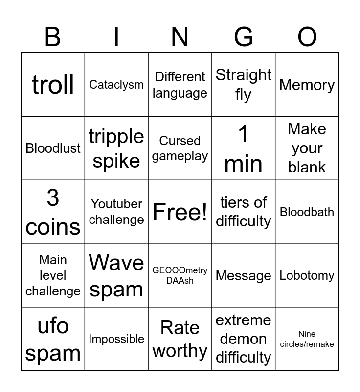 This bingo card has a free space and 27 words: Message, Dash Spider, 1 min, Rate worthy, Bloodlust, Different language, Cataclysm, Main level challenge, tiers of difficulty, Lobotomy, 3 coins, Straight fly, ufo spam, Impossible, Make your blank, cube challenge, tripple spike, Cursed gameplay, Wave spam, troll, Bloodbath, extreme demon difficulty, Youtuber challenge, Nine circles/remake, GEOOOmetry DAAsh, Memory and Move trigger.