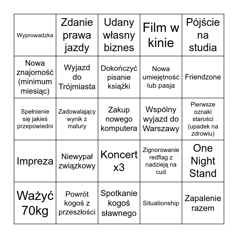 This bingo card has a free space and 24 words: Niewypał związkowy, Powrót kogoś z przeszłości, Dokończyć pisanie książki, Ważyć 70kg, Pójście na studia, Wyprowadzka, Nowa znajomość (minimum miesiąc), Zdanie prawa jazdy, Wspólny wyjazd do Warszawy, Koncert x3, Nowa umiejętność lub pasja, Spełnienie się jakieś przepowiedni, Zignorowanie redflag z nadzieją na cud, One Night Stand, Wyjazd do Trójmiasta, Situationship, Pierwsze oznaki starości (upadek na zdrowiu), Udany własny biznes, Friendzone, Zadowalający wynik z matury, Zapalenie razem, Impreza, Film w kinie and Spotkanie kogoś sławnego.