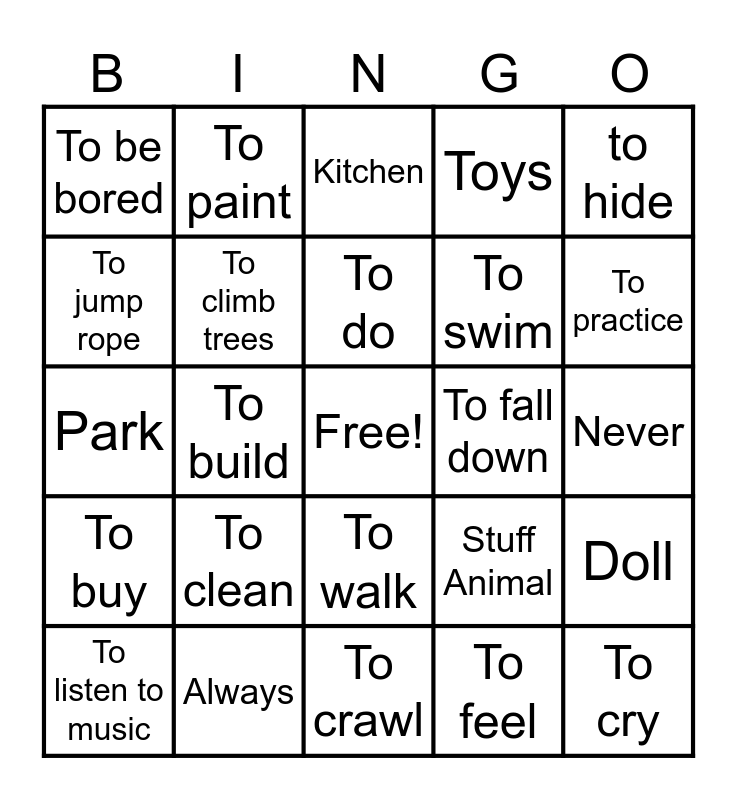 This bingo card has a free space and 47 words: To play, To cry, To use, To crawl, To clean, To draw, To paint, To get mad, To jump rope, To tell jokes, To climb trees, Toys, Doll, Stuff Animal, Hot wheels, To drink, To do, To fall down, To run, to hide, To build, To feel, To be bored, To swim, To study, To practice, To listen to music, To Dance, To walk, To buy, Fun, To eat, To fight, To play videogames, When I was a child, Always, Never, Sometimes, Every day, Every summer, School, Kitchen, Park, Beach, Brother, Cousin and uncle.