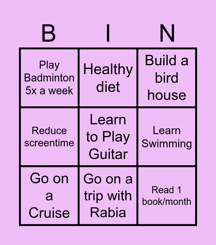 This bingo card has a free space and 8 words: Learn Swimming, Build a bird house, Healthy diet, Go on a Cruise, Play Badminton 5x a week, Read 1 book/month, Reduce screentime and Go on a trip with Rabia.
