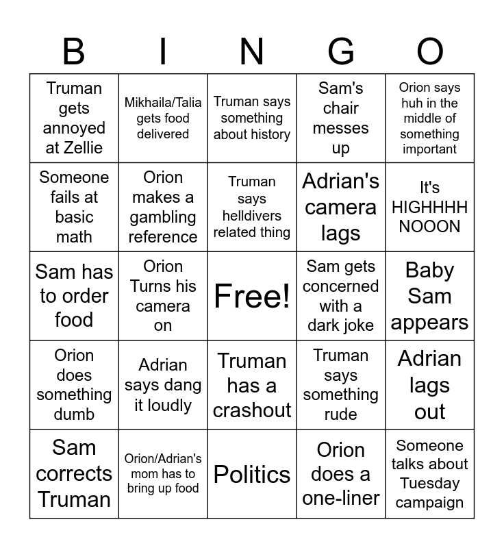 This bingo card has a free space and 24 words: Sam corrects Truman, Adrian says dang it loudly, Truman says helldivers related thing, Orion does a one-liner, Orion says huh in the middle of something important, Truman gets annoyed at Zellie, Mikhaila/Talia gets food delivered, Truman says something about history, Sam gets concerned with a dark joke, Baby Sam appears, Sam has to order food, Orion makes a gambling reference, Truman says something rude, Adrian lags out, Someone fails at basic math, Orion/Adrian's mom has to bring up food, Politics, Sam's chair messes up, It's HIGHHHH NOOON, Orion does something dumb, Orion Turns his camera on, Truman has a crashout, Adrian's camera lags and Someone talks about Tuesday campaign.