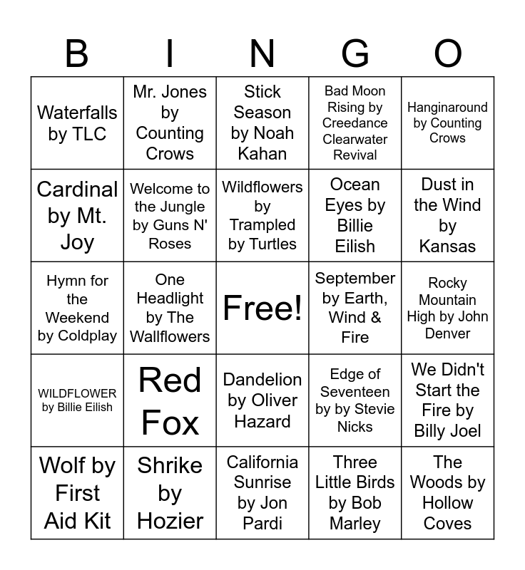 This bingo card has a free space and 75 words: Rivers and Roads by the Head and the Heart, Mr. Blue Sky by Weezer, Stick Season by Noah Kahan, Flowers in Your Hair by The Lumineers, Mountain Sound by Of Monsters and Men, Fishin' in the Dark by Nitty Gritty Dirt Band, Red Dirt Road by Brooks & Dunn, Where the Green Grass Grows by Tim McGraw, Take Me Home, Country Roads by John Denver, Numb Little Bug by Em Beihold, Dancing in the Moonlight by King Harvest, Birds of a Feather by Billie Eilish, Wildflowers by Trampled by Turtles, Cardinal by Mt. Joy, Heat Waves by Glass Animals, One Headlight by The Wallflowers, Honeybee by The Head and the Heart, The Woods by Hollow Coves, The Oaks by All Faces, Hanginaround by Counting Crows, Blackbird by The Beatles, Hymn for the Weekend by Coldplay, Welcome to the Jungle by Guns N' Roses, Mr. Jones by Counting Crows, Bad Moon Rising by Creedance Clearwater Revival, Snow (Hey Oh) by Red Hot Chili Peppers, Hotel California by Eagles, House of the Rising Sun by The Animals, Free Bird by Lynyrd Skynyrd, Purple Rain by Prince, Rock You Like a Hurricane by Scorpions, The Reaper by Blue Oyster Cult, Birding by Swet Shop Boys, Edge of Seventeen by by Stevie Nicks, Dust in the Wind by Kansas, Ocean Eyes by Billie Eilish, Here Comes the Sun by The Beatles, A Sky Full of Stars by Coldplay, Rocky Mountain High by John Denver, Three Little Birds by Bob Marley, Fireflies by Owl City, Barracuda by Heart, Old Pine by Ben Howard, Caroline by Animal Years, The Bird Song by Noah Floersch, Evergreen by Richy Mitch, Wolf by First Aid Kit, Waterfalls by TLC, Day'N'Nite by Kid Cudi, Do I Wanna Know? by Artic Monkeys, Shake the Frost by Tyler Childers, Dandelion by Oliver Hazard, Never Better by Wild Rivers, Northern Cardinal, Rose-breasted Grosbeak, Whip-poor-will, Northern Flicker, Belted Kingfisher, Sandhill Crane, Yellow Headed Blackbird, Red Fox, Mink, Rattle Snake, Coyote, Hip Hop Hooray by Naughty by Nature, September by Earth, Wind & Fire, Ain't No Mountain High Enough by Marvin Gaye, Have You Seen the Rain by Creedance Clearwater Revival, Take it Easy by Eagles, We Didn't Start the Fire by Billy Joel, WILDFLOWER by Billie Eilish, Shrike by Hozier, Swan Upon Leda by Hozier, California Sunrise by Jon Pardi and Never Seen the Rain by Tones And I.