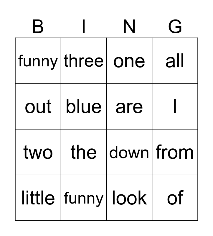 This bingo card has 18 words: the, of, one, funny, down, all, little, three, I, two, look, out, from, blue, are, yellow, funny and two.