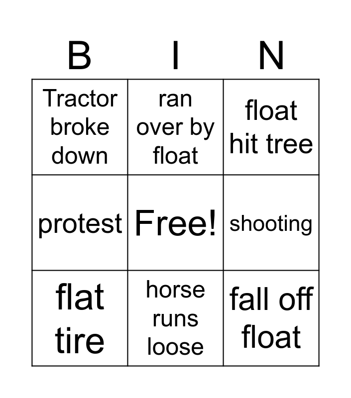 This bingo card has a free space and 8 words: shooting, float hit tree, ran over by float, flat tire, Tractor broke down, fall off float, protest and horse runs loose.