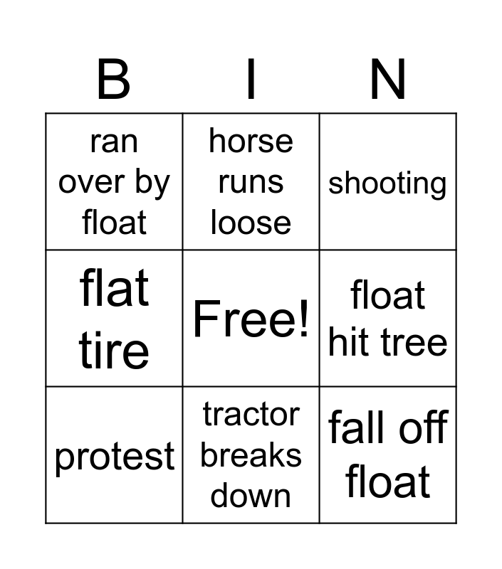 This bingo card has a free space and 8 words: float hit tree, shooting, horse runs loose, protest, ran over by float, fall off float, flat tire and tractor breaks down.