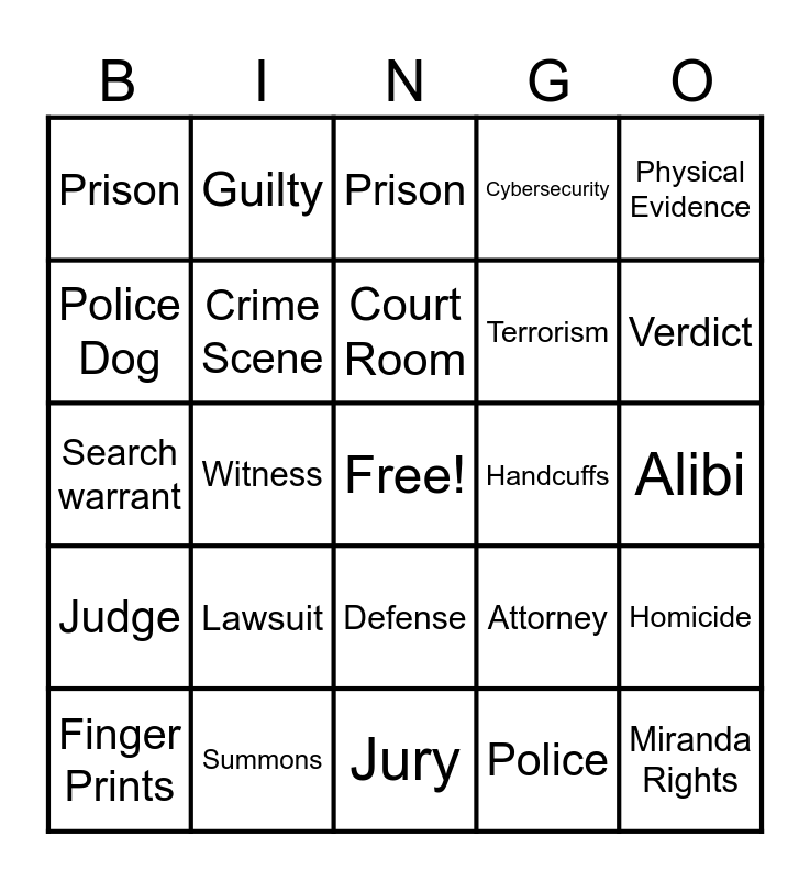 This bingo card has a free space and 34 words: Line up, Police, Jail, Bail, Judge, Crime Scene, Physical Evidence, Finger Prints, Guilty, Criminal, Court Room, Prison, Parole, Gavel, Handcuffs, Verdict, Summons, Search warrant, Lawsuit, Attorney, Defense, Plaintiff, Prison, Alibi, Jury, Miranda Rights, Cybersecurity, Misdemeanor, Terrorism, Police Dog, Forensics, Witness, Homicide and Recidivism.