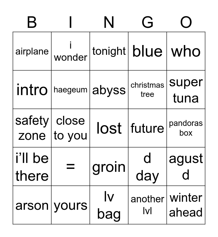 This bingo card has a free space and 24 words: =, yours, abyss, arson, who, airplane, intro, i wonder, future, groin, christmas tree, safety zone, d day, agust d, haegeum, another lvl, pandoras box, tonight, super tuna, close to you, winter ahead, i’ll be there, blue and lv bag.