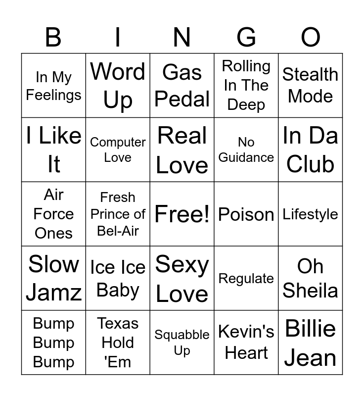 This bingo card has a free space and 52 words: Livin' On A Prayer, Billie Jean, Candy, Squabble Up, Ice Ice Baby, Not Like Us, Word Up, Let's Groove, I Like It, Atomic Dog, Computer Love, Don't Disturb This Groove, Oh Sheila, Regulate, Hypnotize, Return Of The Mack, Real Love, Poison, All I Do Is Win, Stealth Mode, Fresh Prince of Bel-Air, Kevin's Heart, In My Feelings, No Guidance, Yeah!, Party In The U.S.A, Low, Work It, In Da Club, Let Me Love You, Nice For What, Rolling In The Deep, Boo'd Up, That's What I Like, The Box, Gas Pedal, Texas Hold 'Em, Rapper's Delight, U Don't Have To Call, Good Good, Confessions, Pt. II, Lifestyle, Slow Jamz, Bills, Bills, Bills, Sexy Love, Whats Poppin, Gin and Juice, Air Force Ones, Delimma, No More, Bump Bump Bump and T-Shirt.