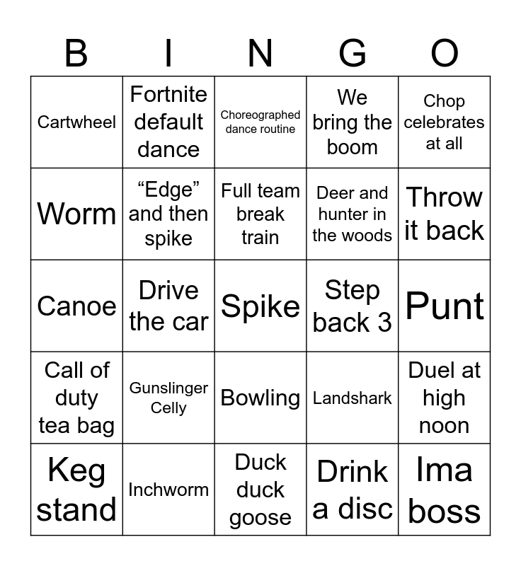 This bingo card has a free space and 24 words: Gunslinger Celly, Inchworm, Full team break train, Keg stand, Chop celebrates at all, Cartwheel, Worm, Fortnite default dance, Step back 3, Bowling, Deer and hunter in the woods, Canoe, Landshark, Duel at high noon, “Edge” and then spike, Drink a disc, Punt, Choreographed dance routine, Throw it back, Drive the car, Ima boss, Call of duty tea bag, We bring the boom and Duck duck goose.