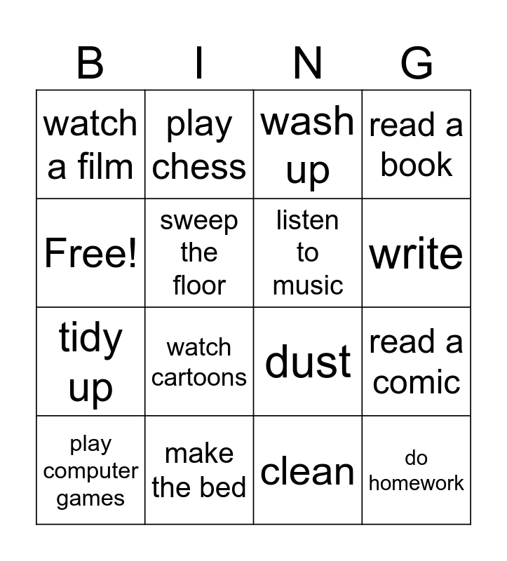 This bingo card has 16 words: make the bed, read a comic, wash up, watch a film, tidy up, play chess, dust, clean, Free!, sweep the floor, play computer games, read a book, watch cartoons, write, listen to music and do homework.