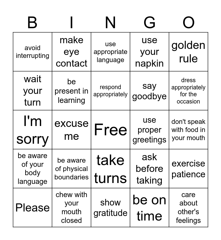 This bingo card has a free space and 29 words: Please, Thank you, excuse me, be an active listener, avoid interrupting, use appropriate language, be present in learning, be aware of physical boundaries, use proper greetings, chew with your mouth closed, don't speak with food in your mouth, care about other's feelings, show gratitude, be on time, dress appropriately for the occasion, Share, take turns, be aware of your body language, golden rule, I'm sorry, ask before taking, avoid reaching across others, say goodbye, wait your turn, use your napkin, make eye contact, exercise patience, respond appropriately and choose kindness.