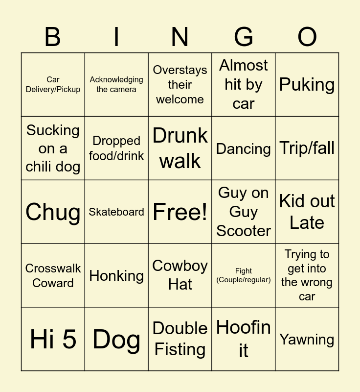 This bingo card has a free space and 63 words: Camera Shy, Litterbug, Bouncer Bouncing, Trying to get into the wrong car, Barefoot, American Flag Clothes, Acknowledging the camera, Bachelorette Party, Drunk walk, meemaw, Cowboy Hat, Sitting on the Street, Kid out Late, Puking, Selfie, Sucking on a chili dog, Skateboard, Car Delivery/Pickup, Twerking, Dancing, Honking, Crosswalk Coward, Almost hit by car, Hug, Handshake, "Wait up", Offensive T shirt, Camo clothes, Shades at Night, Nose Pick, Crotch grab, Crying, Tricycle, Emergency vehicle, Trip/fall, Hi 5, Dumb hat, Hoofin it, Dropped something, Dropped food/drink, Chug, Guy on Guy Scooter, 5 second rule, Dickhead truck, Yawning, Dog, Calls home about camera, Fight (Couple/regular), Mullet, Beach Goth, Formal Attire, Double Fisting, Ghosts and Gravestones, Matching Outfits, Instrument, Overstays their welcome, Bandage Dude, Shiny head, Jeans n Flip Flops, Trash Pickup, Biker Gang (+3), Pizza Slice and cane/crutches/wheelchair.