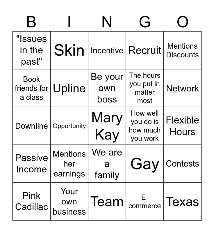 This bingo card has a free space and 24 words: Mentions her earnings, Your own business, Be your own boss, Pink Cadillac, Mentions Discounts, "Issues in the past", Book friends for a class, Skin, How well you do is how much you work, We are a family, The hours you put in matter most, Downline, Gay, Contests, Upline, E-commerce, Flexible Hours, Incentive, Network, Opportunity, Texas, Passive Income, Recruit and Team.