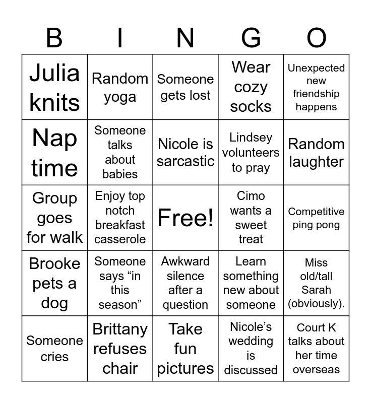 This bingo card has a free space and 24 words: Someone says “in this season”, Brittany refuses chair, Nicole is sarcastic, Someone cries, Unexpected new friendship happens, Julia knits, Nap time, Random yoga, Cimo wants a sweet treat, Awkward silence after a question, Lindsey volunteers to pray, Group goes for walk, Learn something new about someone, Miss old/tall Sarah (obviously)., Someone talks about babies, Nicole’s wedding is discussed, Competitive ping pong, Someone gets lost, Random laughter, Enjoy top notch breakfast casserole, Court K talks about her time overseas, Brooke pets a dog, Wear cozy socks and Take fun pictures.