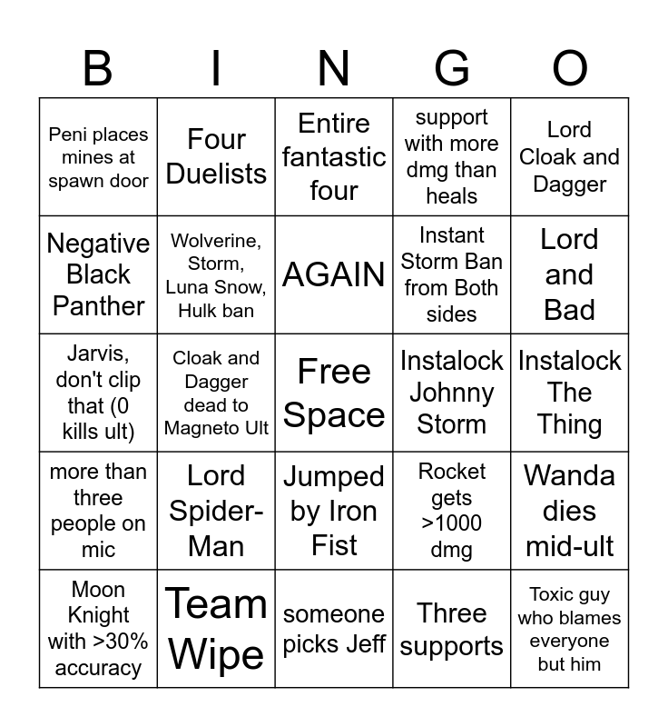 This bingo card has a free space and 24 words: Lord Spider-Man, Team Wipe, AGAIN, Moon Knight with >30% accuracy, Lord Cloak and Dagger, Peni places mines at spawn door, Negative Black Panther, Four Duelists, Instalock Johnny Storm, Jumped by Iron Fist, Instant Storm Ban from Both sides, Jarvis, don't clip that (0 kills ult), Rocket gets >1000 dmg, Wanda dies mid-ult, Wolverine, Storm, Luna Snow, Hulk ban, Three supports, Instalock The Thing, Entire fantastic four, Lord and Bad, Cloak and Dagger dead to Magneto Ult, Toxic guy who blames everyone but him, more than three people on mic, support with more dmg than heals and someone picks Jeff.