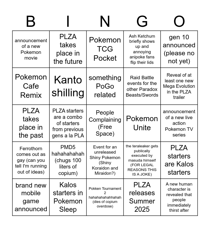 This bingo card has a free space and 24 words: PMD5 hahahahahah (chugs 100 liters of copium), Kalos starters in Pokemon Sleep, something PoGo related, brand new mobile game announced, gen 10 announced (please no not yet), announcement of a new Pokemon movie, Pokemon Cafe Remix, PLZA takes place in the future, Pokemon Unite, Event for an unreleased Shiny Pokemon (Shiny Koraidon and Miraidon?), Raid Battle events for the other Paradox Beasts/Swords, PLZA takes place in the past, the teraleaker gets publically executed by masuda himself (FOR LEGAL REASONS THIS IS A JOKE), PLZA starters are Kalos starters, Kanto shilling, PLZA releases Summer 2025, announcement of a new live action Pokemon TV series, Pokemon TCG Pocket, Reveal of at least one new Mega Evolution in the PLZA trailer, PLZA starters are a combo of starters from previous gens a la PLA, A new human character is revealed that people immediately thirst after, Ferrothorn comes out as gay (can you tell I'm running out of ideas), Ash Ketchum briefly shows up and annoying anipoke fans flip their lids and Pokken Tournament 2 hahahahahahhahah (dies of copium overdose).