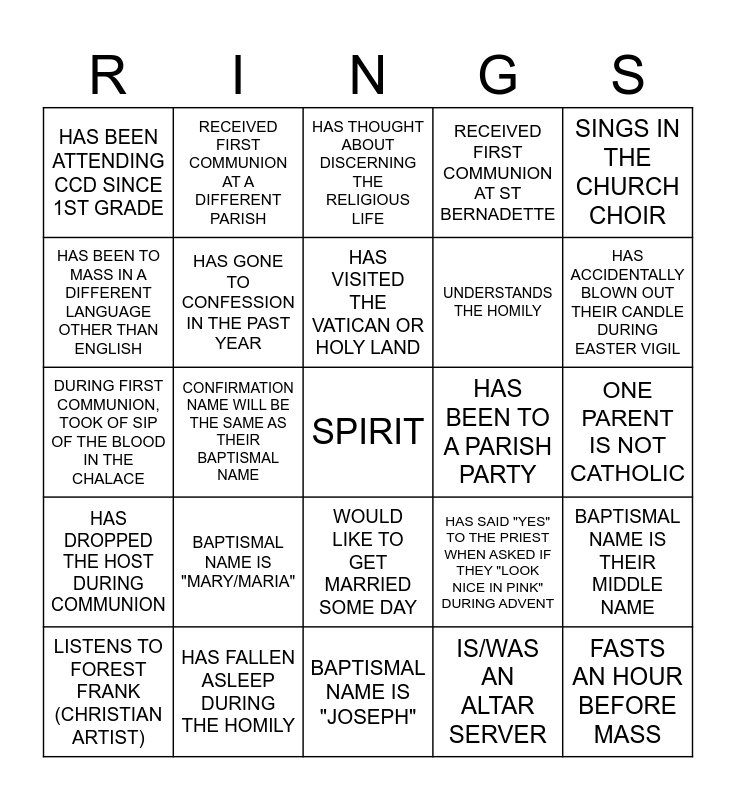 This bingo card has a free space and 24 words: BAPTISMAL NAME IS "MARY/MARIA", HAS FALLEN ASLEEP DURING THE HOMILY, HAS VISITED THE VATICAN OR HOLY LAND, LISTENS TO FOREST FRANK (CHRISTIAN ARTIST), SINGS IN THE CHURCH CHOIR, HAS BEEN ATTENDING CCD SINCE 1ST GRADE, HAS BEEN TO MASS IN A DIFFERENT LANGUAGE OTHER THAN ENGLISH, RECEIVED FIRST COMMUNION AT A DIFFERENT PARISH, HAS BEEN TO A PARISH PARTY, WOULD LIKE TO GET MARRIED SOME DAY, UNDERSTANDS THE HOMILY, DURING FIRST COMMUNION, TOOK OF SIP OF THE BLOOD IN THE CHALACE, HAS SAID "YES" TO THE PRIEST WHEN ASKED IF THEY "LOOK NICE IN PINK" DURING ADVENT, BAPTISMAL NAME IS THEIR MIDDLE NAME, HAS GONE TO CONFESSION IN THE PAST YEAR, IS/WAS AN ALTAR SERVER, ONE PARENT IS NOT CATHOLIC, HAS THOUGHT ABOUT DISCERNING THE RELIGIOUS LIFE, HAS ACCIDENTALLY BLOWN OUT THEIR CANDLE DURING EASTER VIGIL, CONFIRMATION NAME WILL BE THE SAME AS THEIR BAPTISMAL NAME, FASTS AN HOUR BEFORE MASS, HAS DROPPED THE HOST DURING COMMUNION, RECEIVED FIRST COMMUNION AT ST BERNADETTE and BAPTISMAL NAME IS "JOSEPH".