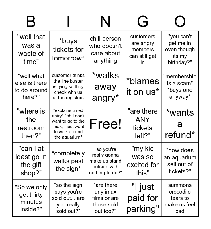 This bingo card has a free space and 24 words: *completely walks past the sign*, "so the sign says you're sold out... are you really sold out?", *walks away angry*, "So we only get thirty minutes inside?", "you can't get me in even though its my birthday?", "well that was a waste of time", "well what else is there to do around here?", *buys tickets for tomorrow*, "are there ANY tickets left?", "so you're really gonna make us stand outside with nothing to do?", *blames it on us*, "where is the restroom then?", "my kid was so excited for this", "how does an aquarium sell out of tickets?", customer thinks the line buster is lying so they check with us at the registers, "I just paid for parking", *wants a refund*, chill person who doesn't care about anything, "membership is a scam" *buys one anyway*, *explains timed entry* "oh I don't want to go to the imax, I just want to walk around the aquarium", summons crocodile tears to make us feel bad, "can I at least go in the gift shop?", customers are angry members can still get in and "are there any imax films or are those sold out too?".