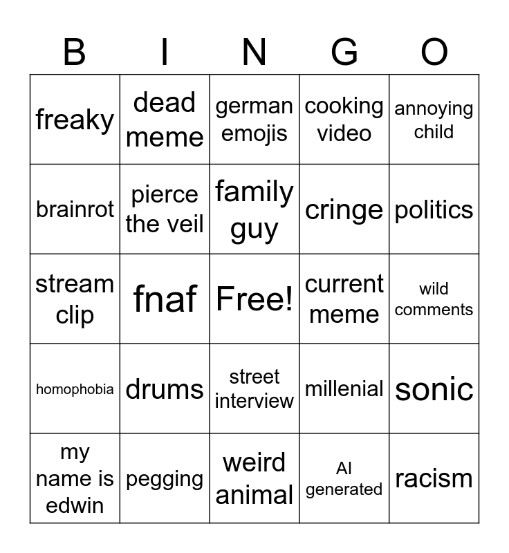 This bingo card has a free space and 24 words: drums, pegging, family guy, my name is edwin, annoying child, freaky, brainrot, dead meme, current meme, street interview, cringe, stream clip, millenial, sonic, pierce the veil, AI generated, wild comments, german emojis, politics, fnaf, racism, homophobia, cooking video and weird animal.