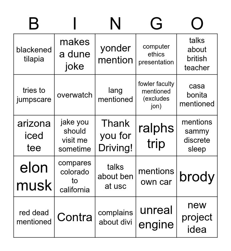 This bingo card has a free space and 24 words: compares colorado to california, Contra, lang mentioned, red dead mentioned, talks about british teacher, blackened tilapia, tries to jumpscare, makes a dune joke, ralphs trip, talks about ben at usc, fowler faculty mentioned (excludes jon), arizona iced tee, mentions own car, brody, overwatch, unreal engine, mentions sammy discrete sleep, yonder mention, casa bonita mentioned, jake you should visit me sometime, new project idea, elon musk, computer ethics presentation and complains about divi.