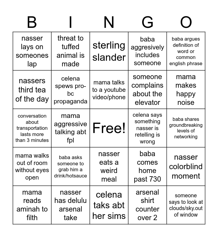 This bingo card has a free space and 29 words: mama reads aminah to filth, baba offers someone his tea, mama aggressive talking abt fpl, nasser shows new tech tip, nasser lays on someones lap, sterling slander, celena spews pro-bc propaganda, baba asks someone to grab him a drink/hotsauce, celena says something nasser is retelling is wrong, nasser has delulu arsenal take, baba shares groundbreaking levels of networking, someone says to look at clouds/sky.out of window, celena taks abt her sims, arsenal shirt counter over 2, mama makes happy noise, baba nasser debate longer than 3 minutes, nasser eats a weird meal, mama walks out of room without eyes open, baba argues definition of word or common english phrase, conversation about transportation lasts more than 3 minutes, baba comes home past 730, mama is late for something, someone complains about the elevator, nassers third tea of the day, baba aggresively includes someone, threat to tuffed animal is made, nasser colorblind moment, mama talks to a youtube video/phone and someone tries to quiz me on cue cards.
