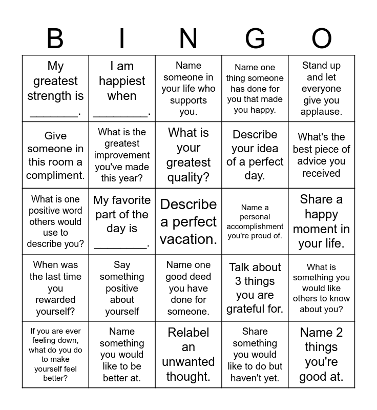 This bingo card has a free space and 24 words: Say something positive about yourself, Name something you would like to be better at., What is your greatest quality?, If you are ever feeling down, what do you do to make yourself feel better?, Stand up and let everyone give you applause., My greatest strength is _______., Give someone in this room a compliment., I am happiest when ________., Name a personal accomplishment you're proud of., Name one good deed you have done for someone., Describe your idea of a perfect day., What is one positive word others would use to describe you?, Talk about 3 things you are grateful for., What is something you would like others to know about you?, What is the greatest improvement you've made this year?, Share something you would like to do but haven't yet., Share a happy moment in your life., Name someone in your life who supports you., What's the best piece of advice you received, My favorite part of the day is ________., Name 2 things you're good at., When was the last time you rewarded yourself?, Name one thing someone has done for you that made you happy. and Relabel an unwanted thought..