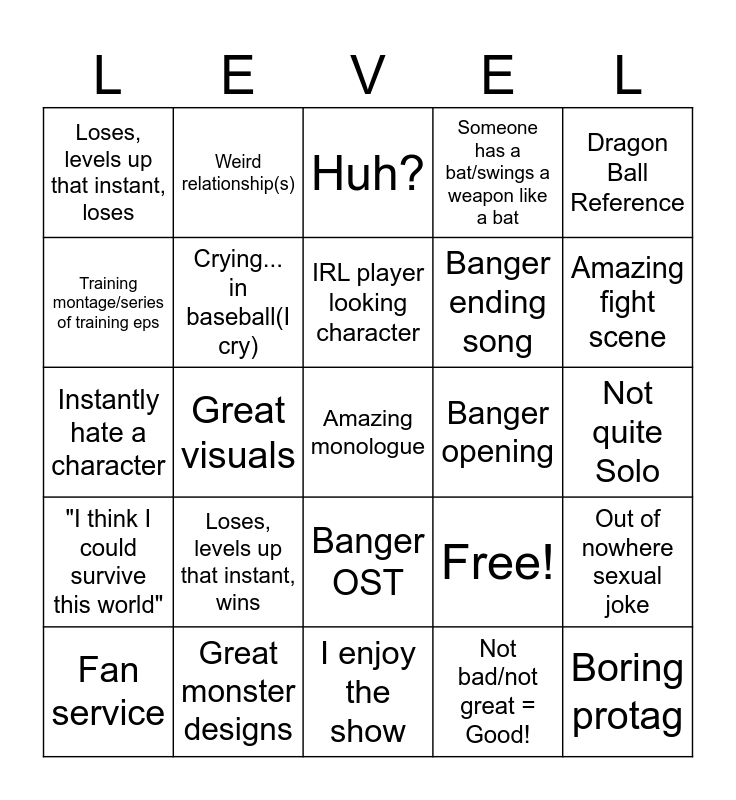 This bingo card has 25 words: Loses, levels up that instant, wins, I enjoy the show, IRL player looking character, Fan service, Dragon Ball Reference, Loses, levels up that instant, loses, Training montage/series of training eps, Weird relationship(s), Banger opening, Banger OST, Banger ending song, Instantly hate a character, Free!, Out of nowhere sexual joke, Crying... in baseball(I cry), Boring protag, Not quite Solo, Huh?, Amazing fight scene, Great visuals, Amazing monologue, Great monster designs, "I think I could survive this world", Someone has a bat/swings a weapon like a bat and Not bad/not great = Good!.
