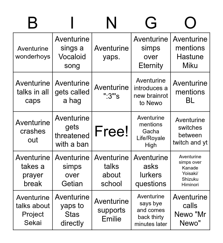 This bingo card has a free space and 24 words: Aventurine talks about Project Sekai, Aventurine simps over Getian, Aventurine ":3"'s, Aventurine says bye and comes back thirty minutes later, Aventurine mentions Hastune Miku, Aventurine wonderhoys, Aventurine sings a Vocaloid song, Aventurine yaps., Aventurine mentions Gacha Life/Royale High, Aventurine switches between twitch and yt, Aventurine crashes out, Aventurine gets called a hag, Aventurine asks lurkers questions, Aventurine simps over Kanade Yoisaki/ Shizuku Himinori, Aventurine talks in all caps, Aventurine yaps to Stas directly, Aventurine supports Emilie, Aventurine simps over Eternity, Aventurine mentions BL, Aventurine takes a prayer break, Aventurine gets threatened with a ban, Aventurine talks about school, Aventurine introduces a new brainrot to Newo and Aventurine calls Newo "Mr Newo".