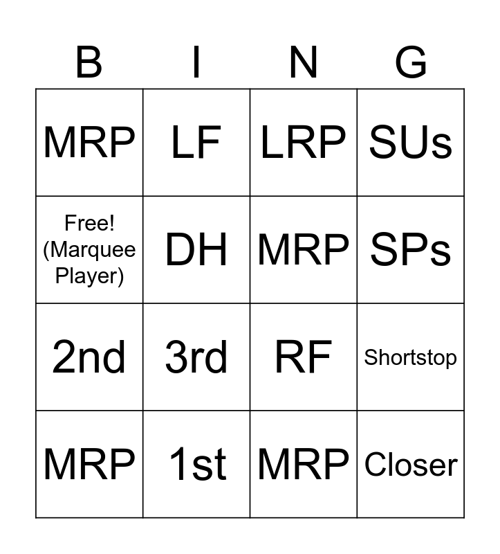 This bingo card has 16 words: 1st, Shortstop, LRP, MRP, 2nd, LF, RF, MRP, Free!(Marquee Player), DH, MRP, SUs, 3rd, SPs, MRP and Closer.