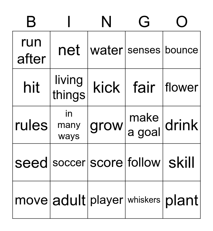 This bingo card has 25 words: soccer, player, kick, move, bounce, run after, hit, net, make a goal, score, fair, rules, follow, skill, living things, plant, drink, water, flower, in many ways, grow, adult, seed, senses and whiskers.