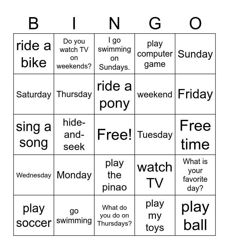 This bingo card has a free space and 24 words: Monday, go swimming, ride a pony, play soccer, Sunday, ride a bike, Saturday, Do you watch TV on weekends?, Tuesday, play the pinao, weekend, sing a song, watch TV, What is your favorite day?, Thursday, play my toys, Free time, I go swimming on Sundays., Friday, hide-and-seek, play ball, Wednesday, play computer game and What do you do on Thursdays?.