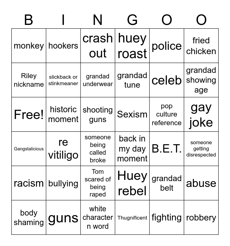 This bingo card has 36 words: Huey rebel, Tom scared of being raped, Thugnificent, Riley nickname, Gangstalicious, Sexism, slickback or stinkmeaner, white character n word, police, grandad belt, grandad showing age, huey roast, abuse, historic moment, grandad tune, monkey, racism, pop culture reference, Free!, crash out, shooting guns, re vitiligo, back in my day moment, someone being called broke, B.E.T., hookers, celeb, guns, grandad underwear, fried chicken, robbery, body shaming, someone getting disrespected, gay joke, bullying and fighting.