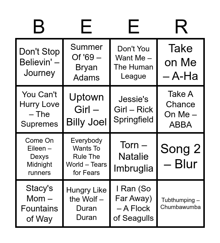 This bingo card has 58 words: Mr. Brightside – The Killers, Since U Been Gone – Kelly Clarkson, Time after Time - Cyndi Lauper, Tubthumping – Chumbawumba, Sweet Caroline – Neil diamond, Dancing Queen – ABBA, Jessie's Girl – Rick Springfield, Ms. Jackson – Outkast, Come On Eileen – Dexys Midnight runners, Livin' On A Prayer – Bon Jovi, Take on Me – A-Ha, ...Baby One More Time – Britney Spears, Got My Mind Set on You - George Harrison, Beat It – Michael Jackson, Africa – TOTO, Don't Stop Believin' – Journey, Stacy's Mom – Fountains of Way, You Can't Hurry Love – The Supremes, What's Up? – 4 Non Blondes, Take A Chance On Me – ABBA, Hungry Like the Wolf – Duran Duran, Don't You Want Me – The Human League, I'll Be There for You – The Rembrants, Kids In America – Kim Wilde, 99 Luftballons – Nena, I Ran (So Far Away) – A Flock of Seagulls, Let's Dance – David Bowie, Tainted Love – Soft Cell, Everybody Wants To Rule The World – Tears for Fears, Always Something There to Remind Me – Naked Eyes, No Scrubs - TLC, Don't Dream It's Over – Crowded House, Jump – Van Halen, Escape (The Pina Colada Song) - Robert Holmes, Like a Prayer - Madonna, Take Me Out - Franz Ferdinand, Wonderwall - Oasis, Song 2 – Blur, Torn – Natalie Imbruglia, Get Lucky – Daft Punk, We didn't start the fire - Bruce Springsteen, Zombie – The Cranberries, Complicated – Avril Lavigne, Total Eclipse of the Heart – Bonnie Tyler, Mamma Mia - ABBA, It's Still Rock and Roll to Me – Billy Joel, Piano Man – Billy Joel, Heaven Is A Place On Earth – Belinda Carlisle, More than a feeling - Boston, I Love Rock 'N Roll – Joan Jett, Blinding Lights – Th Weekend, Rolling in the Deep – Adele, Beds Are Burning – Midnight Oil, Free Fallin' – Tom Petty, Summer Of '69 – Bryan Adams, It's My Life – Bon Jovi, Uptown Girl – Billy Joel and I'm Gonna Be – The Proclaimers.