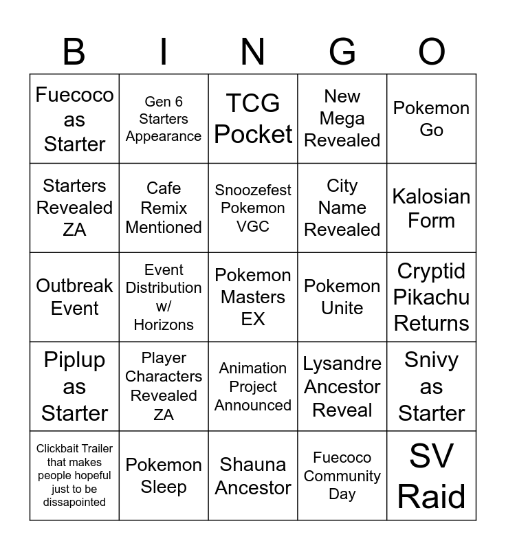This bingo card has a free space and 24 words: Player Characters Revealed ZA, Pokemon Sleep, Snoozefest Pokemon VGC, Clickbait Trailer that makes people hopeful just to be dissapointed, Pokemon Go, Fuecoco as Starter, Starters Revealed ZA, Gen 6 Starters Appearance, Pokemon Unite, Animation Project Announced, City Name Revealed, Outbreak Event, Lysandre Ancestor Reveal, Snivy as Starter, Cafe Remix Mentioned, Fuecoco Community Day, Cryptid Pikachu Returns, TCG Pocket, Kalosian Form, Event Distribution w/ Horizons, SV Raid, Piplup as Starter, New Mega Revealed and Shauna Ancestor.