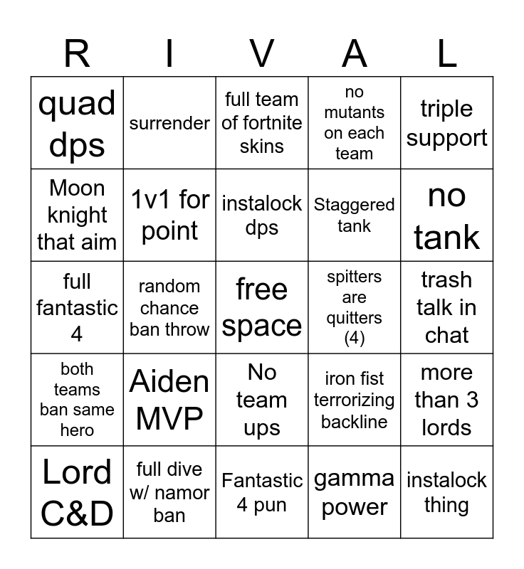 This bingo card has a free space and 25 words: Aiden MVP, Fantastic 4 pun, instalock dps, Lord C&D, triple support, quad dps, Moon knight that aim, surrender, spitters are quitters (4), No team ups, Staggered tank, full fantastic 4, iron fist terrorizing backline, more than 3 lords, 1v1 for point, storm/ banner ban, trash talk in chat, full team of fortnite skins, no tank, random chance ban throw, instalock thing, full dive w/ namor ban, both teams ban same hero, no mutants on each team and gamma power.