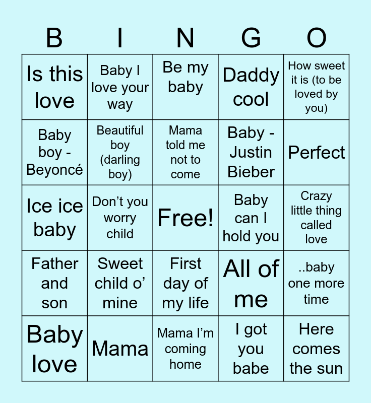 This bingo card has a free space and 28 words: ..baby one more time, Baby got Back, Baby - Justin Bieber, I got you babe, Baby boy - Beyoncé, Be my baby, Baby I love your way, Father and son, Baby can I hold you, Baby love, Ice ice baby, Daddy cool, Mama, Mama I’m coming home, Perfect, Your song, Sweet child o’ mine, Beautiful boy (darling boy), Mama told me not to come, First day of my life, Is this love, Baby you make me crazy, Here comes the sun, Don’t you worry child, Crazy little thing called love, All of me, How sweet it is (to be loved by you) and What a wonderful world.