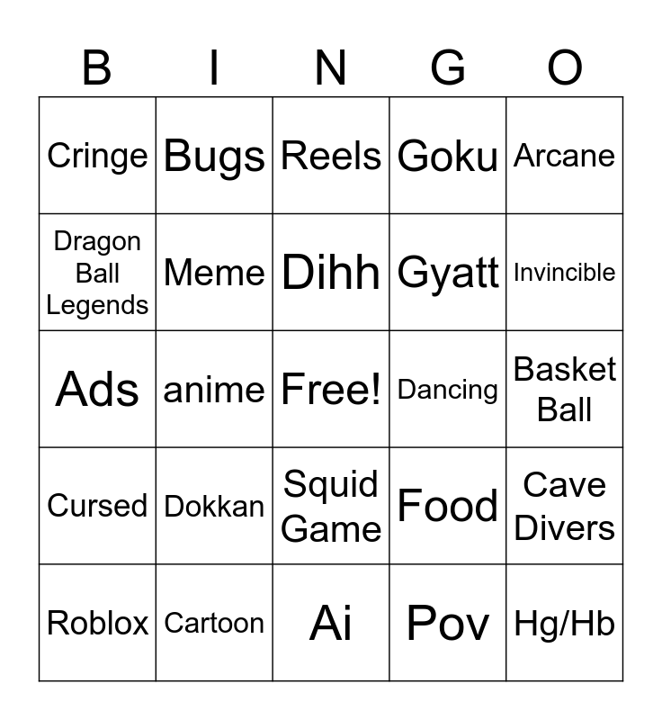 This bingo card has a free space and 24 words: Dokkan, Cartoon, Dihh, Roblox, Arcane, Cringe, Dragon Ball Legends, Bugs, Dancing, Squid Game, Gyatt, Ads, Food, Cave Divers, Meme, Pov, Basket Ball, Reels, Invincible, anime, Hg/Hb, Cursed, Goku and Ai.