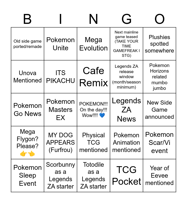 This bingo card has a free space and 24 words: MY DOG APPEARS (Furfrou), Scorbunny as a Legends ZA starter, Cafe Remix, Pokemon Sleep Event, Plushies spotted somewhere, Old side game ported/remade, Unova Mentioned, Pokemon Unite, Legends ZA News, Physical TCG mentioned, Legends ZA release window (month/season minimum), Pokemon Go News, Pokemon Animation mentioned, Pokemon Scar/Vi event, ITS PIKACHU, TCG Pocket, New Side Game announced, Mega Evolution, Pokemon Horizons related mumbo jumbo, Pokemon Masters EX, Year of Eevee mentioned, Mega Flygon? Please? 👉👈, Next mainline game teased (TAKE YOUR TIME GAMEFREAK I STG) and Totodile as a Legends ZA starter.