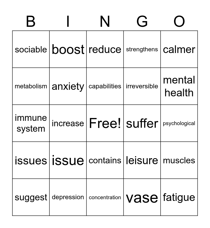 This bingo card has a free space and 29 words: suggest, relationships, increase, cooperate, sociable, reduce, anxiety, issue, suffer, depression, psychological, fatigue, concentration, vase, mental health, disorders, contains, issues, calmer, immune system, leisure, recreation, irreversible, metabolism, strengthens, boost, muscles, capabilities and broadens.