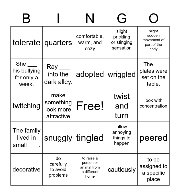 This bingo card has a free space and 24 words: snuggly, do carefully to avoid problems, adopted, decorative, slight sudden movement of part of the body, tolerate, She ___ his bullying for only a week., quarters, twist and turn, tingled, wriggled, twitching, allow annoying things to happen, peered, Ray ___ into the dark alley., cautiously, look with concentration, comfortable, warm, and cozy, The ___ plates were set on the table., make something look more attractive, to be assigned to a specific place, The family lived in small ___., slight prickling or stinging sensation and to raise a person or animal from a different home.