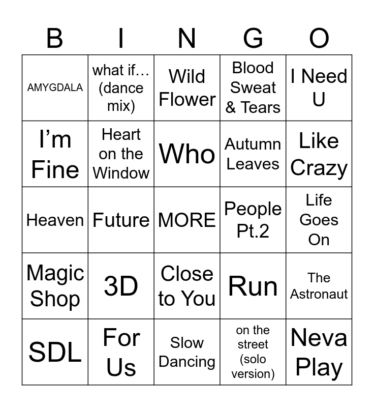 This bingo card has a free space and 24 words: 3D, For Us, Who, SDL, I Need U, AMYGDALA, I’m Fine, what if… (dance mix), People Pt.2, Close to You, Autumn Leaves, Heaven, Run, The Astronaut, Heart on the Window, on the street (solo version), Life Goes On, Wild Flower, Like Crazy, Future, Neva Play, Magic Shop, Blood Sweat & Tears and Slow Dancing.