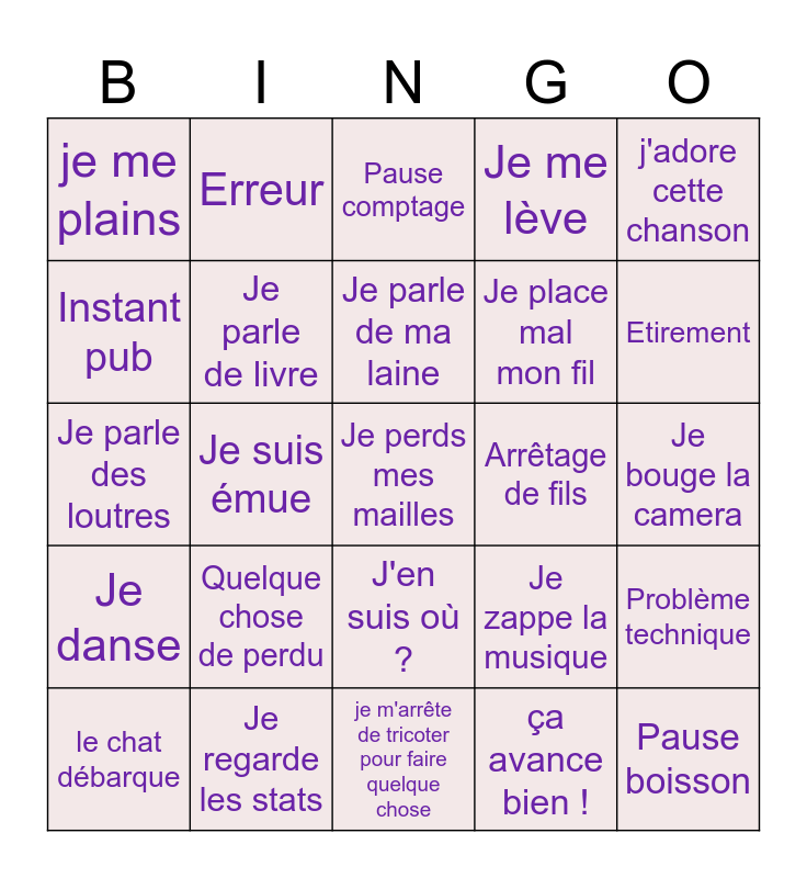 This bingo card has 25 words: Quelque chose de perdu, je m'arrête de tricoter pour faire quelque chose, Je parle de ma laine, le chat débarque, j'adore cette chanson, je me plains, Instant pub, Erreur, Arrêtage de fils, J'en suis où ?, Je place mal mon fil, Je parle des loutres, Je zappe la musique, Problème technique, Je parle de livre, Pause boisson, Je bouge la camera, Pause comptage, Etirement, Je suis émue, Je perds mes mailles, Je regarde les stats, Je danse, Je me lève and ça avance bien !.